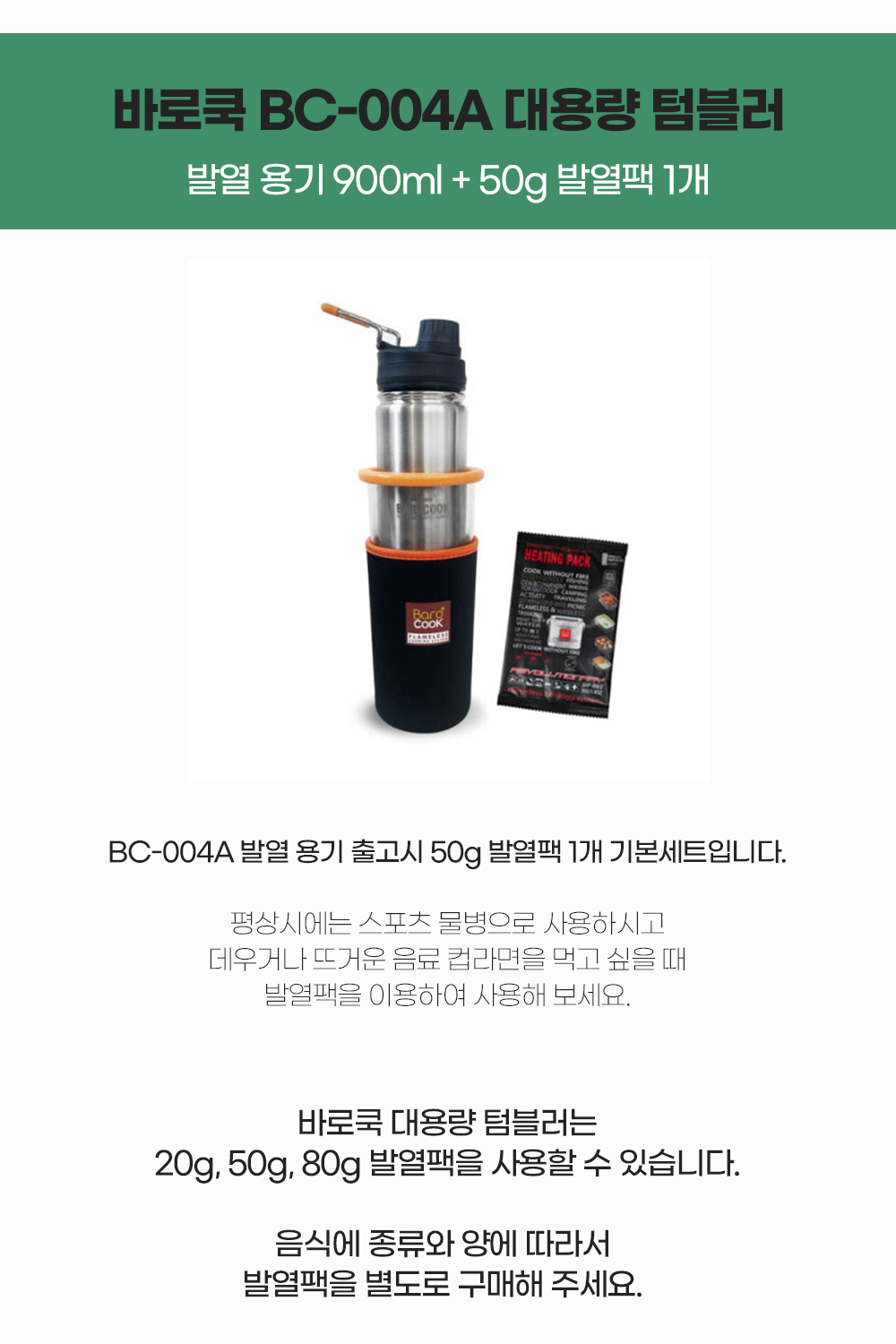 대용량 바로쿡 텀블러는 20그램,50그램,80그램 발열팩을 사용하실수 있습니다.